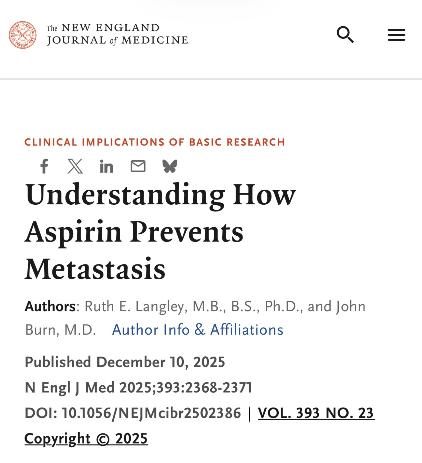 New research (2025) explains exactly how aspirin inhibits cancer (mechanism of action)— these results should lead to more specific clinical trials determining those who will or will not derive a survival benefit.